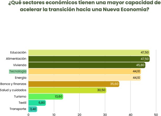 El informe identifica, junto a la vivienda, otros ámbitos con mayor capacidad para acelerar la transición y llevarla a escala. En concreto, señala como sectores «palanca» aquellos que combinan impacto directo en la vida cotidiana con un efecto tractor sobre el conjunto del modelo productivo: educación, alimentación y vivienda, junto a tecnología, energía y banca/finanzas, además de salud y cuidados.